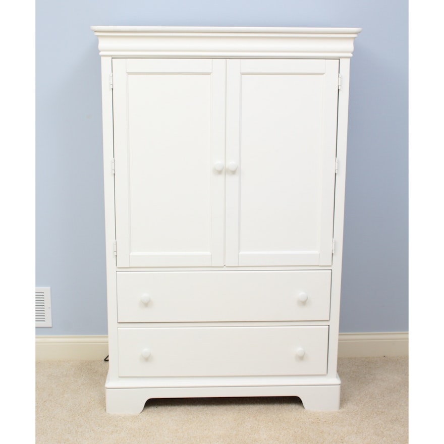 Stanley Furniture Isabella Armoire. It features a gallery edge to the top, an oval mirror to the door with raised relief trim and floral motifs, and rounded columns to the front corners. Made of poplar and select hardwood solids with poplar and hardwood veneers.